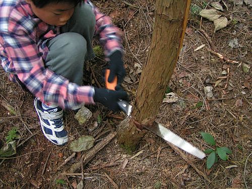 のこぎりを使って気を切ります。ある程度切り進んでくると、木の重みで逆にのこぎりがはさまれて動きにくくなったりして、比較的細い木でも子供たちには大変そうです。