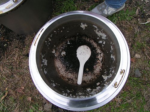 午前中の作業で、トップの写真にあるように、かなりの本数を切り出すことができました。お昼ごはんは、釜で炊いたごはんです!燃料は薪ですよ!