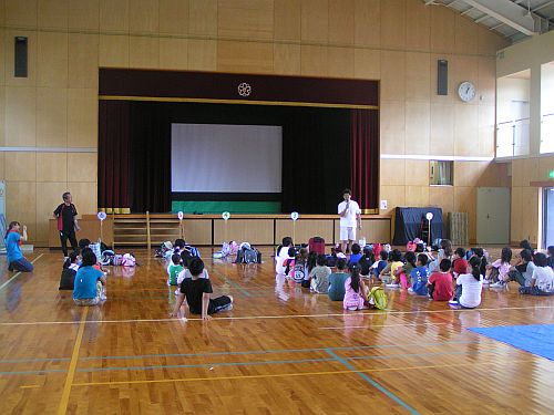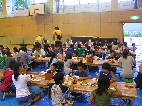 さて、24日午後、体育館に集合してサマースクールの開会式です。このとき、PTA会長が「今日、学校に泊まれるのはお手伝いしてくれる保護者の方々のおかげです。お礼を言いましょう」と、子供たちに促しました。物事の始めに、まず感謝の意を伝える、ということはすごく良いですね。