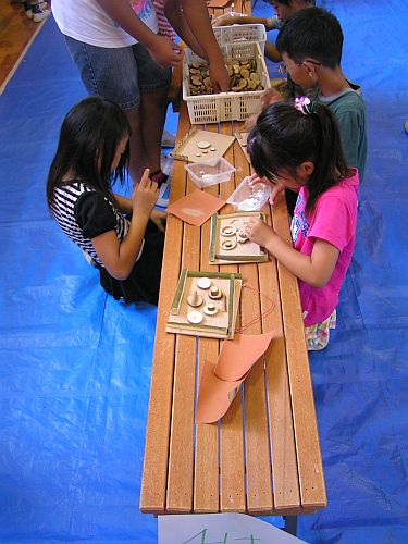 平面的に作品を仕上げるのではなくて、立体的に作品を作る子どもが意外に多く見られました。また、材料の形を組み合わせてセミやカブトムシといったオブジェを丁寧に作っていた人もいました。皆さん、すごい器用ですよ。