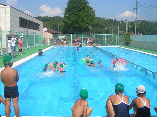 作品作りの後は、暑い日差しの中、プールです。宝探しや浮き輪リレー等で楽しんでいました。