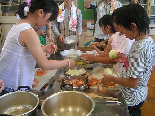 料理担当班は家庭科室で、野菜を準備します。このときは、玉葱を切ってましたね。どこからともなく「猫の手!」と頻繁に声がかかってましたよ。