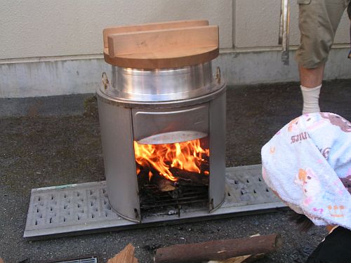 意外と薪に火がつきやすかったので、比較的簡単にいい感じで火をおこすことができました。出来上がるまでの間に、かまどと炊飯器との違いや便利さを話しながら、食事の大切さを説いていきます。