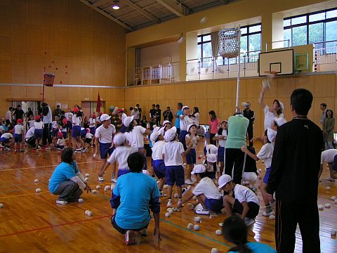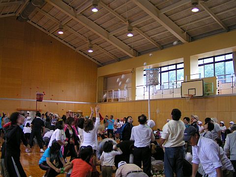 体育館でも保護者や地域の方々と共に競技を行います。こちらは玉入れ、保護者・一般参加バージョン。