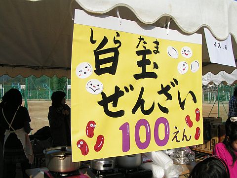 一方、舞台の反対側では、子ども達に楽しんでもらうために、PTA等が中心となって店を出します。樫田小のお母さんたちは、白玉ぜんざいとジュースの販売です。