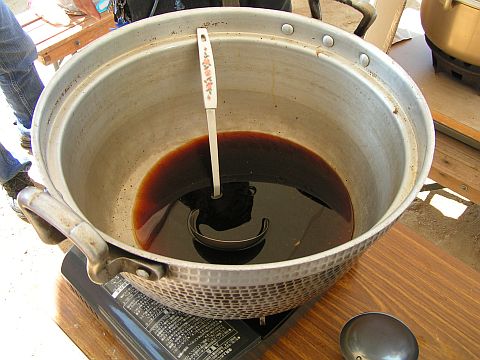 あっと言う間にダシがなくなりました。こちらのダシ、現場で昆布と鰹で作った手作りだしです(あとから聞いた話では、結構いい匂いがしていたとか)。裏で大急ぎで次のダシを作っていたのですが、全く間に合いません。当日の暑さから販売ペースを甘く見ていたおやじさんたち、必死です。