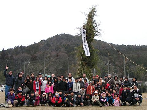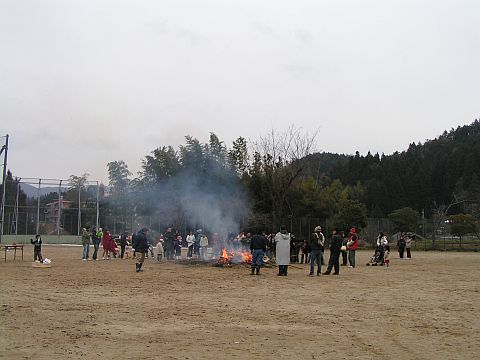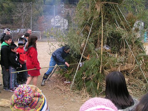 2011年1月15日(土)、とんど焼きを行いました。とんど焼きとは、正月のしめ飾り等を長い竹で組んで立てたもので焼く、という風習です。樫田小学校では毎年12月に地域の方々にお手伝い戴いて、子ども達がしめ飾りを作ってきます。私の家では、この正月も子どもが作ったしめ縄を飾り、今回それを持ち寄ってきました。
