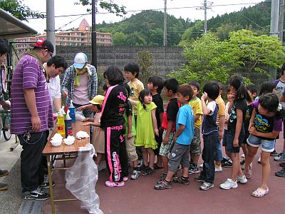 さて、昼食後はおやじさんたちの出番。程よく暑い気候の中、かき氷をしました。昨年の高槻まつりでもやっているので、だいぶ手馴れた様子のおやじさんたちです。