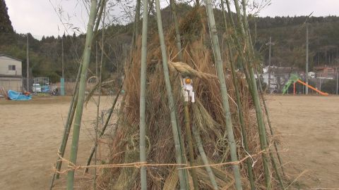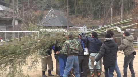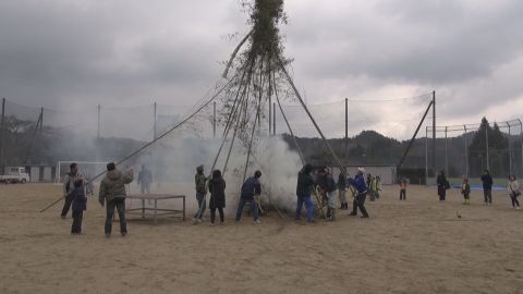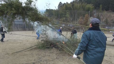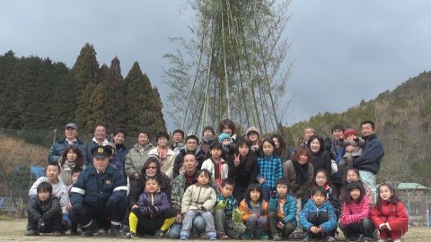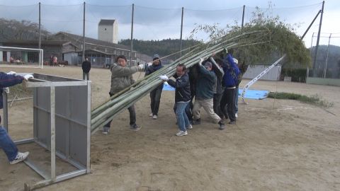 2012年1月14日(土)に、今年もとんど焼きを行うことができました。ちなみに昨年の様子はこちら。今年は、昨年よりも長くて大きな竹を準備しました。竹を立てるだけでもかなり大変です。