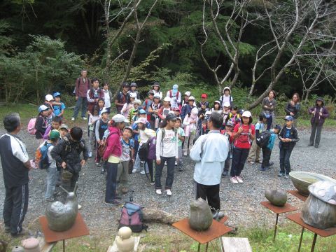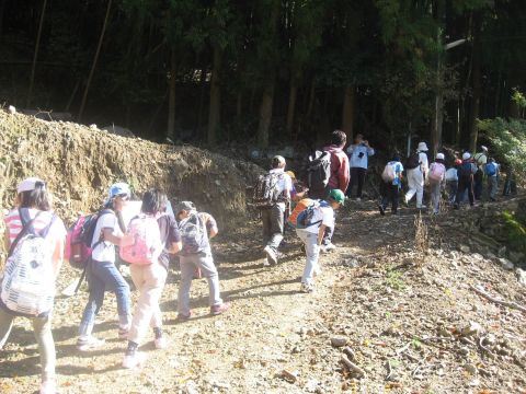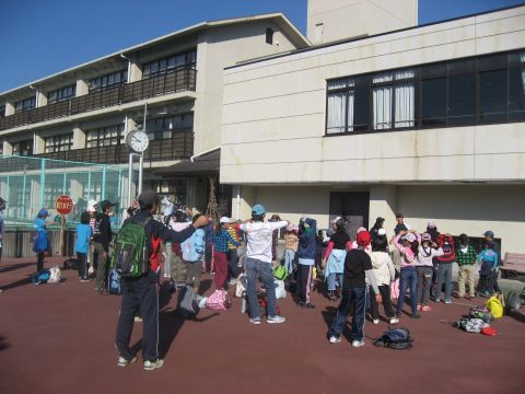 全校児童47名と教員、保護者も入れて総勢71名でポンポン山頂上を目指します。高学年が低学年をサポートするのが樫田小学校の味です。まずは、校庭で体をほぐします。