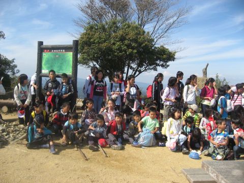 ポンポン山の山頂にて集合写真。みんな、どこ見てんのかな?実は樫田小学校が後方に見えています。