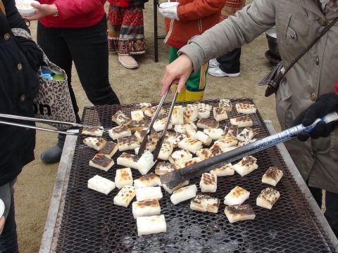 一方、お母さんたちはたくさんのお餅を焼いて、楽しそうにぜんざいの準備をしています。