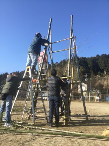 さて、今年のとんどでは初めての試みを行いました。例年の組み上げ方と異なり、「やぐら」を組み上げて萱などを敷き詰め、外側から竹をかぶせる、という組み上げ方をやってみました。