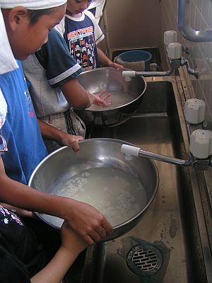 プールからあがった子供たちは一休みした後、夕食の準備をします。お米担当班は、お米を研ぎます。