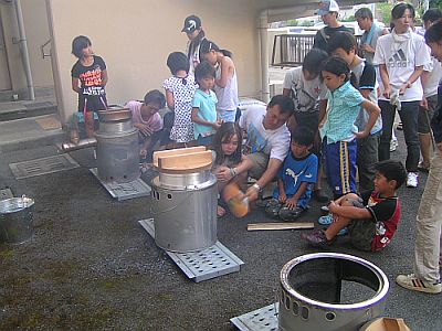 意外と薪に火がつきやすかったので、比較的簡単にいい感じで火をおこすことができました。出来上がるまでの間に、かまどと炊飯器との違いや便利さを話しながら、食事の大切さを説いていきます。