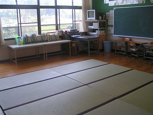 子どもたちがプールに入っている間に、教室では寝床の準備。そうです、いつも勉強している教室で宿泊するのですよ!教室に畳を敷いて、ここに泊まるのです。どうです?こういう小学校って、楽しくないですか?