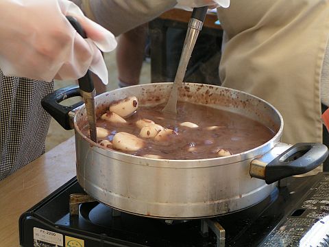 一方、舞台の反対側では、子ども達に楽しんでもらうために、PTA等が中心となって店を出します。樫田小のお母さんたちは、白玉ぜんざいとジュースの販売です。