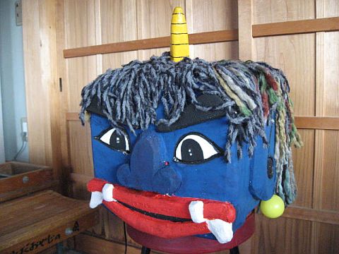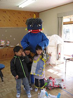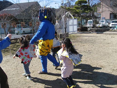 樫田では毎年この時期になると、樫田の山に住むオニさんが、子どもたちの健康を願って樫田幼稚園、樫田小学校に現れます。2011年1月31日(月)、ちょっと気の早いアオオニさんが樫田に出没。しかしまた、何で最低気温マイナス8度の日に出没したんでしょうか?