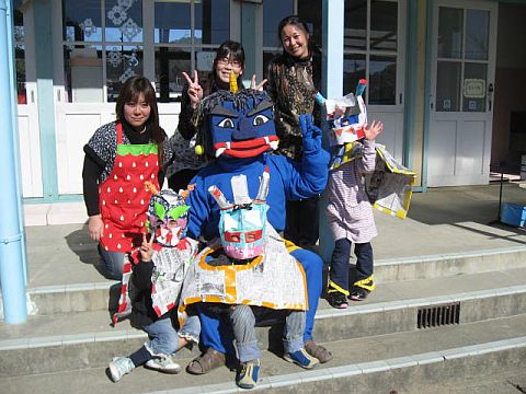 園児たちもオニのお面をかぶって、『一緒に記念撮影だオニ』