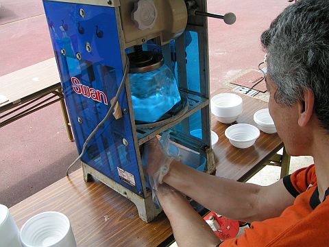 さて、昼食後はおやじさんたちの出番。程よく暑い気候の中、かき氷をしました。昨年の高槻まつりでもやっているので、だいぶ手馴れた様子のおやじさんたちです。