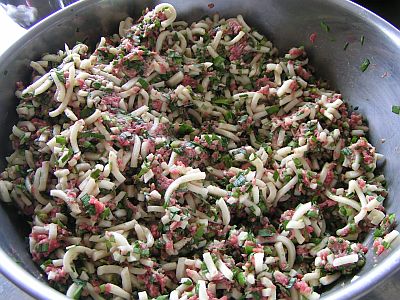 さて、子どもたちが遊んでいる間に、お母さんたちは昼食の準備。今回のメインメニューは「うどん餃子」。高槻の人なら聞いたことがあると思いますが、餃子のタネにうどんを入れてそのまま焼いたものです。