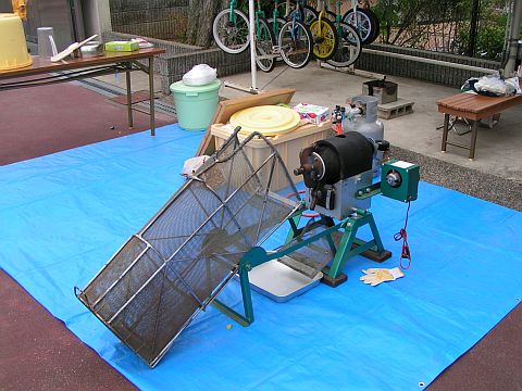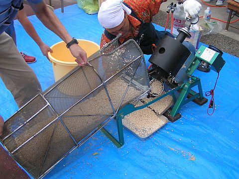 実はこのぽん菓子器、先月まで岩手県大槌町で活躍していたものです。所有者のおやじさんが被災地にぽん菓子器を持ち込んで、長期間のボランティア活動をされていたと聞いています。