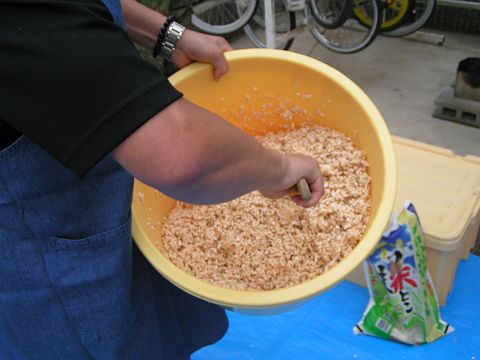 できたものと、蜜(砂糖と水飴を煮詰めたもの)を混ぜ合わせると、できあがり。